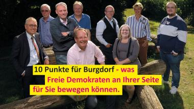 Wir vor Ort stehen für eine Politik, die auf Eigeninitiative, Tatkraft und Kreativität der Menschen setzt. Wir übernehmen Verantwortung für ein wirtschaftlich starkes, weltoffenes und modernes Burgdorf. Mit ein bisschen mehr Kreativität im Rat kann Burgdorf noch attraktiver, digitaler und freier werden.